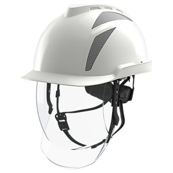 Descripción: Casco para Electricista, sin ventilación, con pantalla facial integrada contra arco eléctrico. Protección cabeza y protección facial integrada en una solución, con suspensión Fas Trac III de 6 puntos y visor certificado para protección contra arco eléctrico según GS-ET-29 clase 1 (4 kA), para uso en aquellas aplicaciones en las que exista riesgo de impacto a la cabeza, radiación UV, salpicaduras de metal fundido y arco eléctrico.