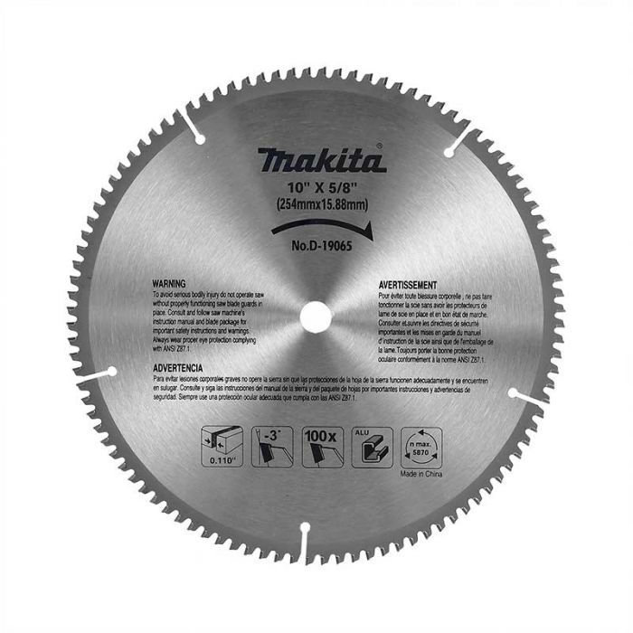 Usar en: Sierra Circular 5007NB. Aplicación : Aluminio. Diámetro: 10 pulg. Eje: 5/8 pulg. Dientes: 100 x. Vel. Máx: 5,870 rpm.